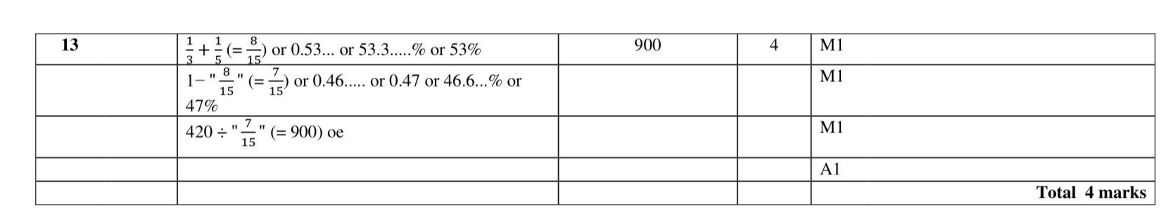 Each month Edna spends all her income on rent, on travel and on other living expenses. She spends $$\(\frac{1}{3}\)$$ of her income on rent. She spends $$\(\frac{1}{5}\)$$ of her income on travel. She spends $$\(\$ 420\)$$ of her income on other living expenses. Work out her income each month. $$\(\$\)$$