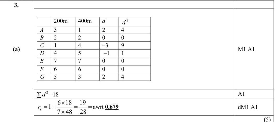 Each of 7 athletes competed in a 200 metre race and a 400 metre race. The table shows the time, in seconds, taken by each athlete to complete the 200 metre race. The finishing order in the 400 metre race is shown below, with athlete $$\(A\)$$ finishing in the fastest time. Calculate the Spearman's rank correlation coefficient between the finishing order in the 200 metre race and the finishing order in the 400 metre race. (5)