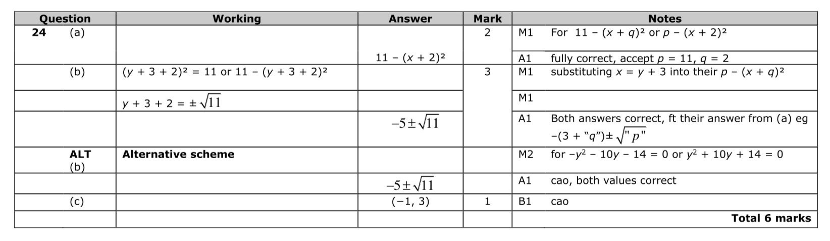 Express $$\(7-4 x-x^{2}\)$$ in the form $$\(p-(x+q)^{2}\)$$ where $$\(p\)$$ and $$\(q\)$$ are constants. (2) (b) Use your answer to part (a) to solve the equation $$\(7-4(y+3)-(y+3)^{2}=0\)$$ Give your solutions in the form $$\(e \pm \sqrt{f}\)$$ where $$\(e\)$$ and $$\(f\)$$ are integers. (3) The curve $$\(\mathbf{C}\)$$ has equation $$\(y=3-5(x+1)^{2}\)$$ The point $$\(A\)$$ is the maximum point on $$\(\mathbf{C}\)$$. (c) Write down the coordinates of $$\(A\)$$. (1)
