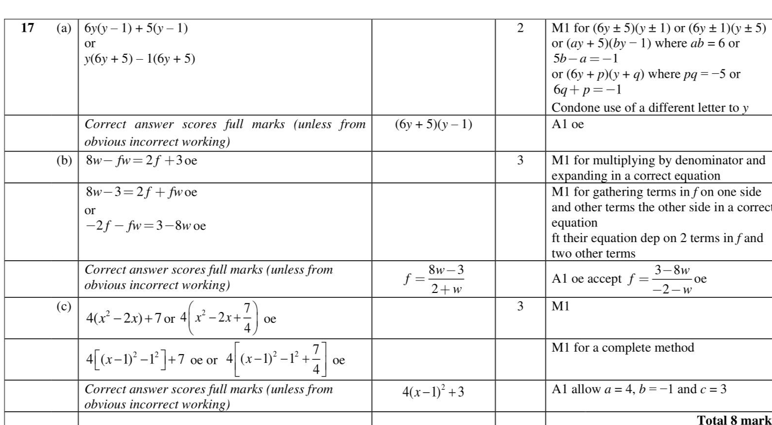 Factorise $$\(6 y^{2}-y-5\)$$ (2) (b) Make $$\(f\)$$ the subject of $$\(w=\frac{2 f+3}{8-f}\)$$ (3) (c) Express $$\(4 x^{2}-8 x+7\)$$ in the form $$\(a(x+b)^{2}+c\)$$ where $$\(a, b\)$$ and $$\(c\)$$ are integers. (3)