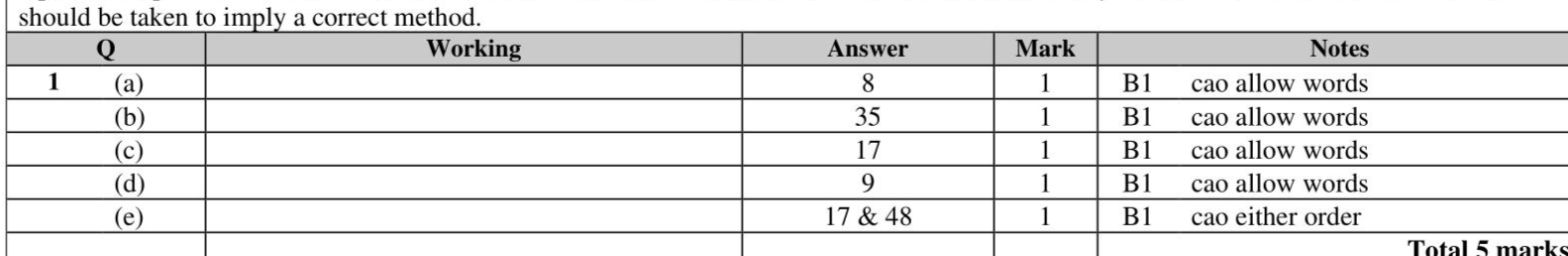 From the numbers in the box, write down (a) a factor of 40 (1) (b) a multiple of 7 (1) (c) a prime number (1) (d) a square number (1) (e) the two numbers with a difference of 31 and (1)