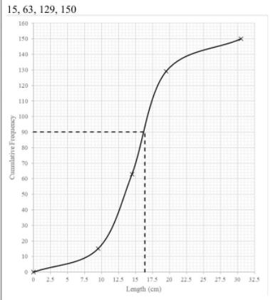 Helen measures the lengths of 150 fish of a certain species in a large pond. These lengths, correct to the nearest centimetre, are summarised in the following table. Draw a cumulative frequency graph to illustrate the data.
