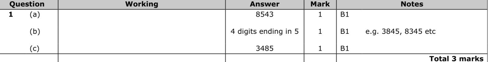 Here are four discs. Each disc has a number on it. These four discs are arranged to make the number 3854 (a) Arrange the four discs to make the largest possible number. (1) (b) Arrange the four discs to make a multiple of 5 (1) (c) Arrange the four discs to make the smallest possible odd number. (1)