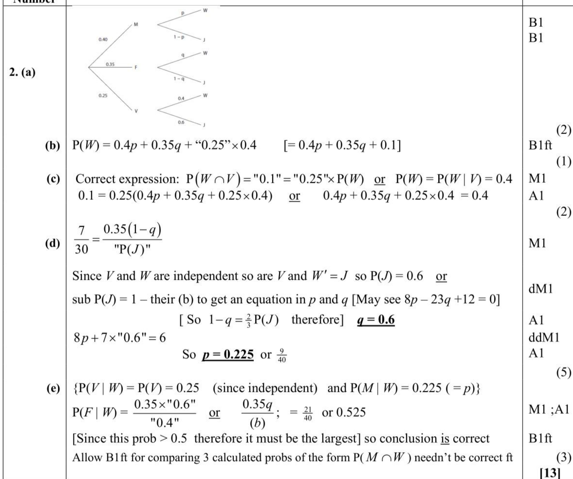 In a school canteen, students can choose from a main course of meat $$\((M)\)$$, fish $$\((F)\)$$ or vegetarian $$\((V)\)$$. They can then choose a drink of either water $$\((W)\)$$ or juice $$\((J)\)$$. The partially completed tree diagram, where $$\(p\)$$ and $$\(q\)$$ are probabilities, shows the probabilities of these choices for a randomly selected student. (a) Complete the tree diagram, giving your answers in terms of $$\(p\)$$ and $$\(q\)$$ where appropriate. (2) (b) Find an expression, in terms of $$\(p\)$$ and $$\(q\)$$, for the probability that a randomly selected student chooses water to drink. (1) The events "choosing a vegetarian main course" and "choosing water to drink" are independent. (c) Find a linear equation in terms of $$\(p\)$$ and $$\(q\)$$. (2) A student who has chosen juice to drink is selected at random. The probability that they chose fish for their main course is $$\(\frac{7}{30}\)$$ (d) Find the value of $$\(p\)$$ and the value of $$\(q\)$$. (5) The canteen manager claims that students who choose water to drink are most likely to choose a fish main course. (e) State, showing your working clearly, whether or not the manager's claim is correct. (3)