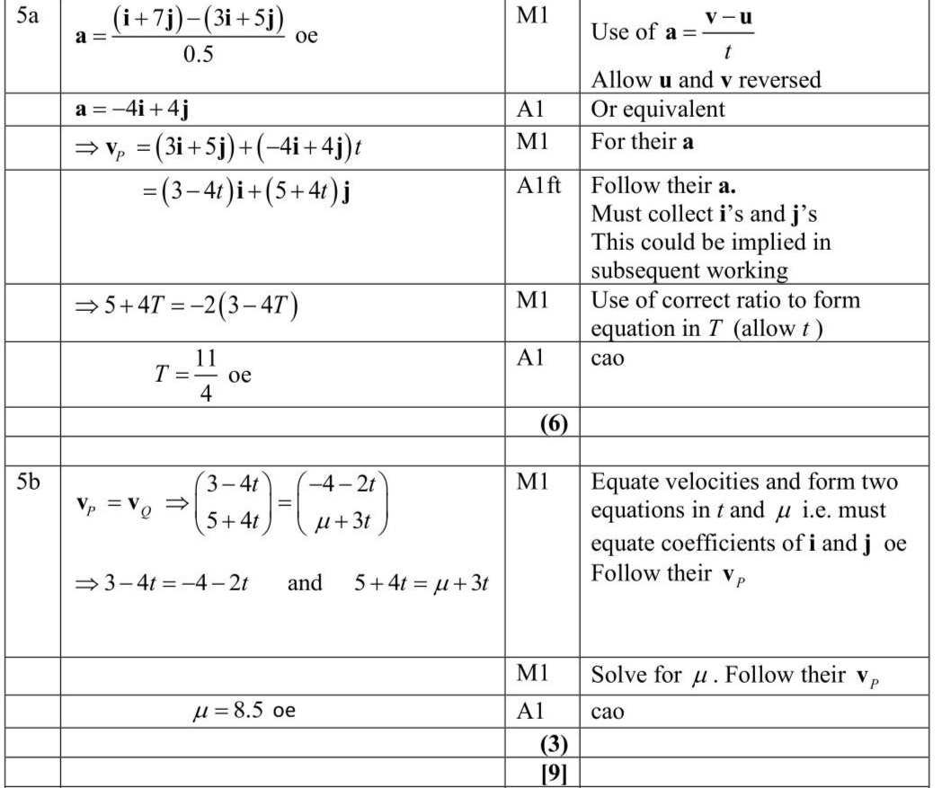 [In this question $$\(\mathbf{i}\)$$ and $$\(\mathbf{j}\)$$ are perpendicular horizontal unit vectors.] A particle $$\(P\)$$ is moving with constant acceleration. At $$\(2 \mathrm{pm}\)$$, the velocity of $$\(P\)$$ is $$\((3 \mathbf{i}+5 \mathbf{j}) \mathrm{km} \mathrm{h}^{-1}\)$$ and at $$\(2.30 \mathrm{pm}\)$$ the velocity of $$\(P\)$$ is $$\((\mathbf{i}+7 \mathbf{j}) \mathrm{km} \mathrm{h}^{-1}\)$$ At time $$\(T\)$$ hours after $$\(2 \mathrm{pm}, P\)$$ is moving in the direction of the vector $$\((-\mathbf{i}+2 \mathbf{j})\)$$ (a) Find the value of $$\(T\)$$. (6) Another particle, $$\(Q\)$$, has velocity $$\(\mathbf{v}_{Q} \mathrm{~km} \mathrm{~h}^{-1}\)$$ at time $$\(t\)$$ hours after $$\(2 \mathrm{pm}\)$$, where $$\[ \mathbf{v}_{Q}=(-4-2 t) \mathbf{i}+(\mu+3 t) \mathbf{j} \]$$ and $$\(\mu\)$$ is a constant. Given that there is an instant when the velocity of $$\(P\)$$ is equal to the velocity of $$\(Q\)$$, (b) find the value of $$\(\mu\)$$. (3)