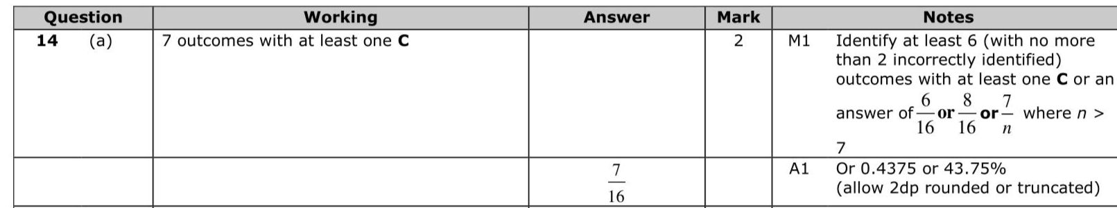 Javier has two sets of cards. Each set contains 4 cards, one marked $$\(\mathbf{A}\)$$, one marked $$\(\mathbf{B}\)$$, one marked $$\(\mathbf{C}\)$$ and one marked $$\(\mathbf{D}\)$$. Javier is going to take at random one card from each set. The table shows all possible pairs of cards that Javier could take. (a) Find the probability that Javier will take at least one card marked $$\(\mathbf{C}\)$$. (2)