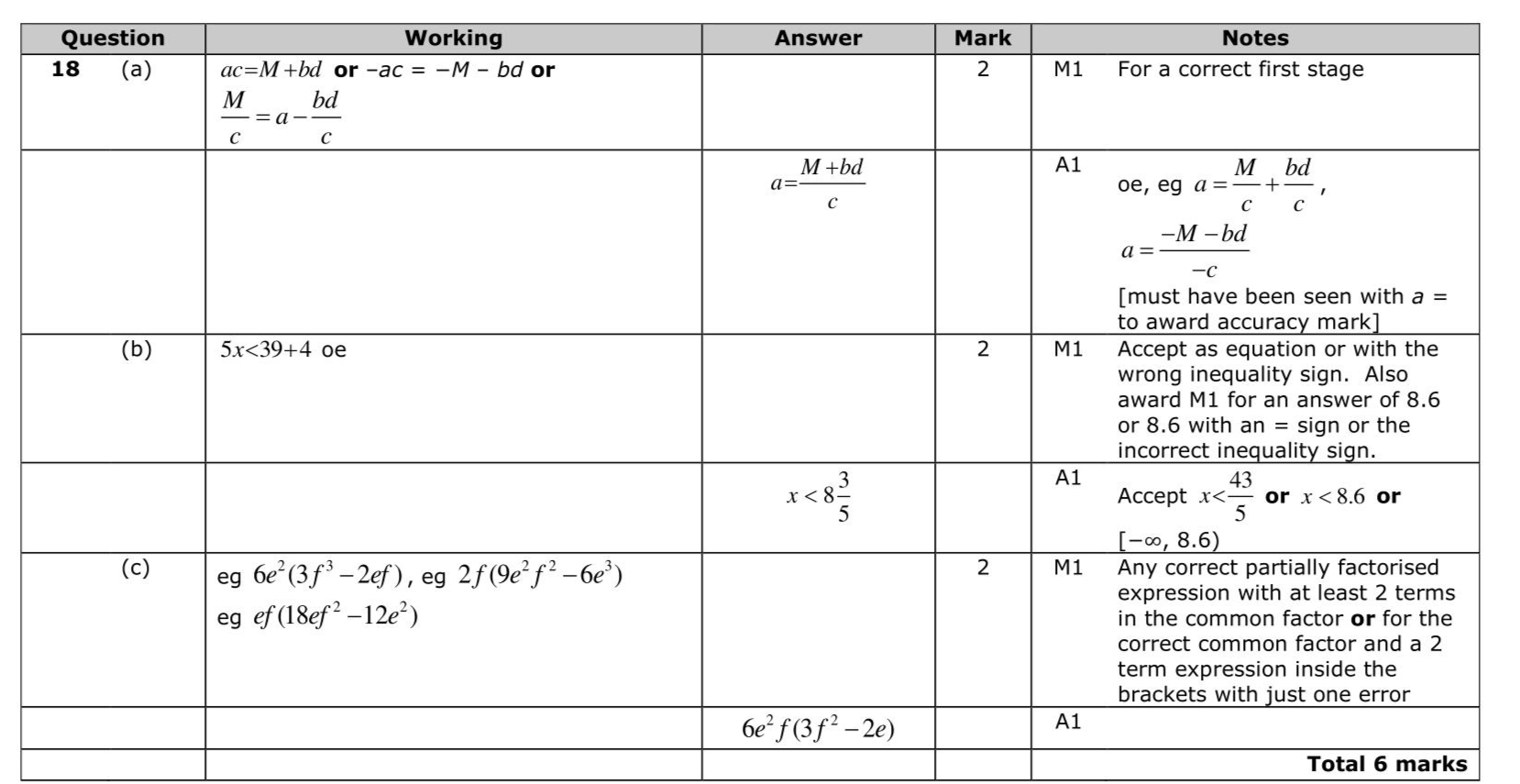 Make $$\(a\)$$ the subject of the formula $$\(M=a c-b d\)$$ (2) (b) Solve the inequality $$\(5 x-4< 39\)$$ (2) (c) Factorise fully $$\(18 e^{2} f^{3}-12 e^{3} f\)$$ (2)