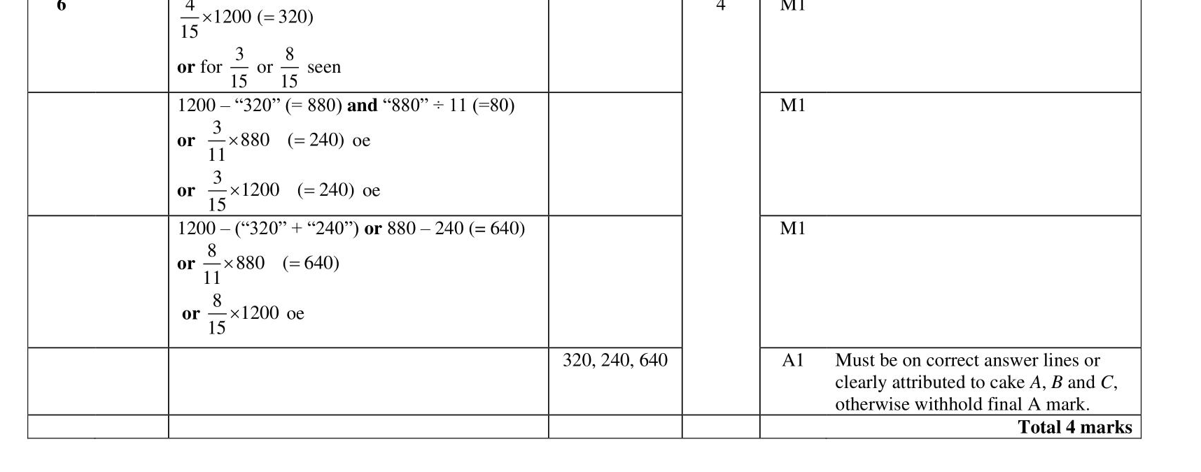 Mikhal has 1200 grams of cake mixture. He is going to make 3 cakes, cake $$\(A\)$$, cake $$\(B\)$$ and cake $$\(C\)$$. $$\(\frac{4}{15}\)$$ of the weight of the cake mixture will be used to make cake $$\(A\)$$. The rest of the cake mixture will be used to make cake $$\(B\)$$ and cake $$\(C\)$$. The weight of the cake mixture used to make cake $$\(B\)$$ and the weight of the cake mixture used to make cake $$\(C\)$$ will be in the ratio $$\(3: 8\)$$ Work out the weight of the cake mixture used to make each of cake $$\(A\)$$, cake $$\(B\)$$ and cake $$\(C\)$$. Cake $$\(A\)$$ grams Cake $$\(B\)$$ grams Cake $$\(C\)$$ grams