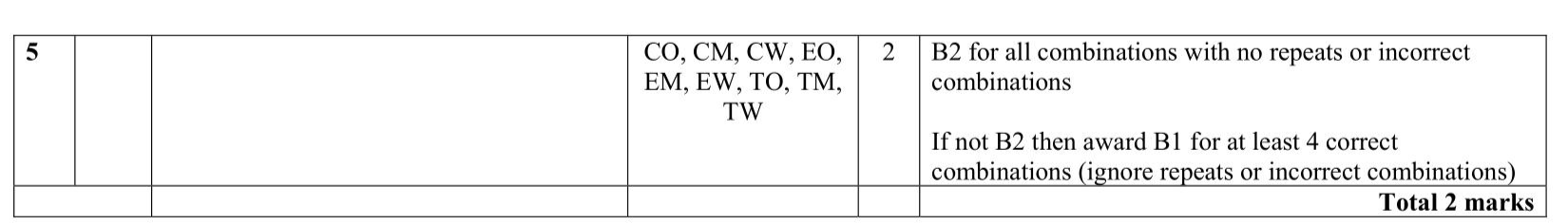 Paul is buying a sandwich and a drink in a meal deal. He can have a cheese sandwich $$\((C)\)$$ or an egg sandwich $$\((E)\)$$ or a tomato sandwich $$\((T)\)$$. He can have orange juice $$\((O)\)$$ or milk $$\((M)\)$$ or water $$\((W)\)$$ to drink. Write down all the possible combinations Paul can buy.