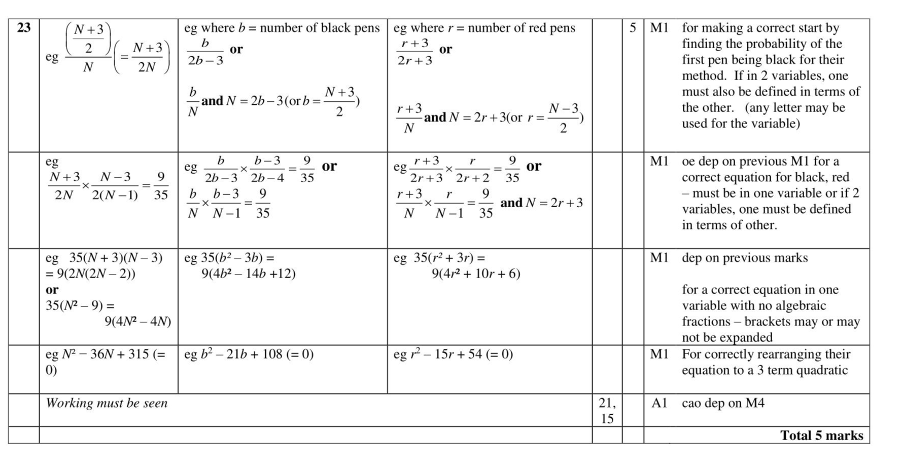 Pippa has a box containing $$\(N\)$$ pens. There are only black pens and red pens in the box. The number of black pens in the box is 3 more than the number of red pens. Pippa is going to take at random 2 pens from the box. The probability that she will take a black pen followed by a red pen is $$\(\frac{9}{35}\)$$ Find the possible values of $$\(N\)$$. Show clear algebraic working.