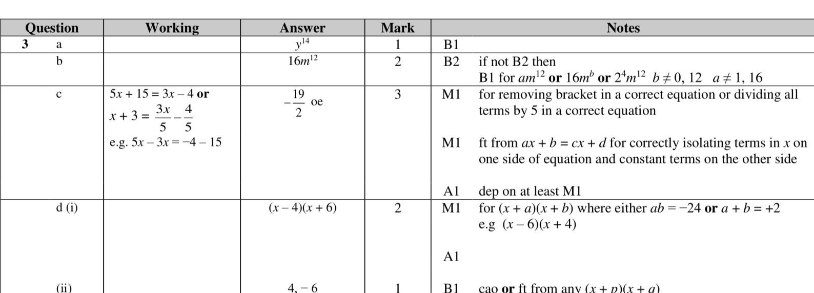 Simplify $$\(y^{5} \times y^{9}\)$$ (1) (b) Simplify $$\(\left(2 m^{3}\right)^{4}\)$$ (2) (c) Solve $$\(5(x+3)=3 x-4\)$$ Show clear algebraic working. $$\[ x= \]$$ (3) (d) (i) Factorise $$\(x^{2}+2 x-24\)$$ (2) (ii) Hence, solve $$\(x^{2}+2 x-24=0\)$$ (1)