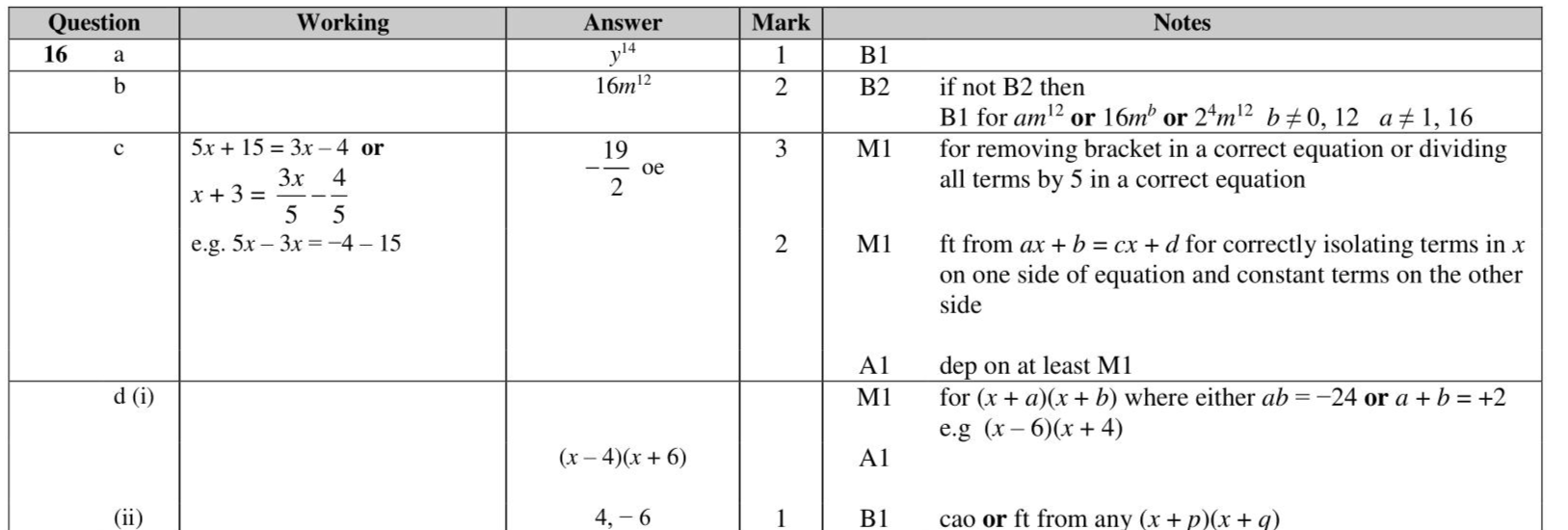 Simplify $$\(y^{5} \times y^{9}\)$$ (1) (b) Simplify $$\(\left(2 m^{3}\right)^{4}\)$$ (2) (c) Solve $$\(5(x+3)=3 x-4\)$$ Show clear algebraic working. $$\(x=\)$$ (3) (d) (i) Factorise $$\(x^{2}+2 x-24\)$$ (2) (ii) Hence, solve $$\(x^{2}+2 x-24=0\)$$