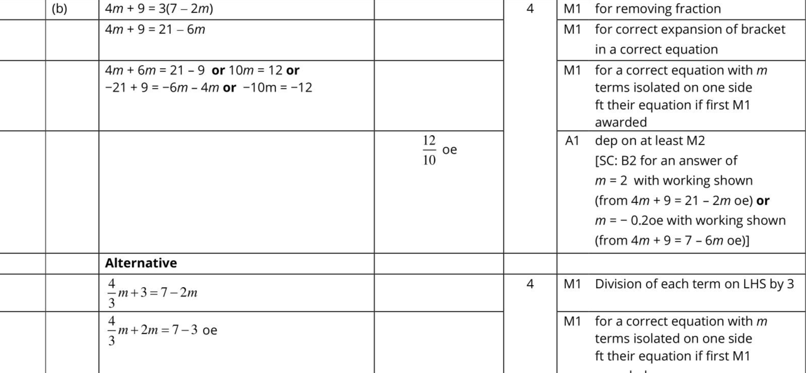Solve $$\(\frac{4 m+9}{3}=7-2 m\)$$ Show clear algebraic working. $$\[ m= \]$$ (4)