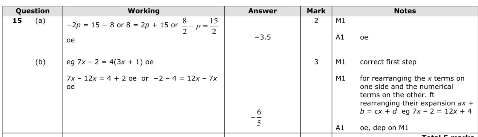 Solve $$\(8-2 p=15\)$$ $$\[ p= \]$$ (2) (b) Solve $$\(\frac{7 x-2}{4}=3 x+1\)$$ Show clear algebraic working. $$\[ x= \]$$ (3)