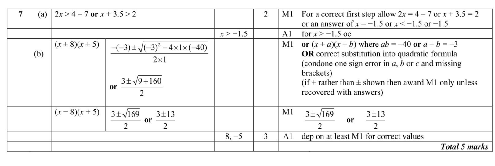 Solve the inequality $$\(2 x+7> 4\)$$ (2) (b) Solve $$\(x^{2}-3 x-40=0\)$$ Show clear algebraic working. (3)