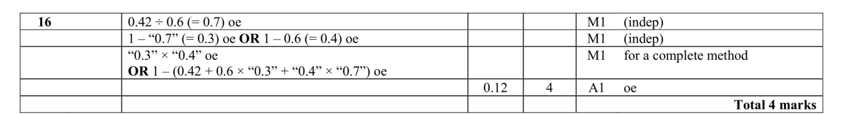 Steffi is going to play one game of tennis and one game of chess. The probability that she will win the game of tennis is 0.6 The probability that she will win both games is 0.42 Work out the probability that she will not win either game.