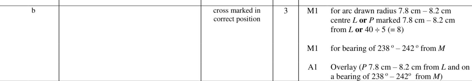The accurate scale drawing shows the positions of two ships, $$\(L\)$$ and $$\(M\)$$. The scale of the drawing is $$\(1 \mathrm{~cm}\)$$ to $$\(5 \mathrm{~km}\)$$. Ship $$\(P\)$$ is $$\(40 \mathrm{~km}\)$$ from $$\(L\)$$ and on a bearing of $$\(240^{\circ}\)$$ from $$\(M\)$$. (b) On the diagram, mark with a cross $$\((X)\)$$ the position of ship $$\(P\)$$. (3)