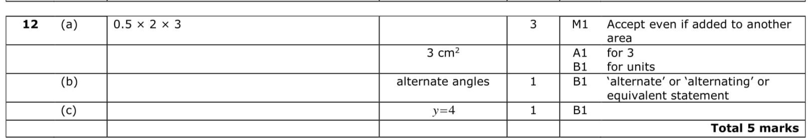The diagram shows a quadrilateral $$\(A B C D\)$$ on a centimetre grid. (a) Work out the area of triangle $$\(A B C\)$$. You must include the units with your answer. (3) (b) Give a reason why angle $$\(A C D\)$$ is equal to angle $$\(C A B\)$$. (1) (c) Write down an equation for the straight line that passes through $$\(D\)$$ and $$\(C\)$$. (1)