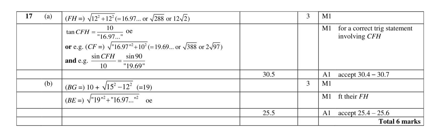 The diagram shows a prism $$\(A B C D E F G H\)$$ with a horizontal base. Diagram NOT accurately drawn The base of the prism, $$\(E F G H\)$$, is a square of side $$\(12 \mathrm{~cm}\)$$. Trapezium $$\(A D E F\)$$ is a cross section of the prism where $$\(A F\)$$ and $$\(D E\)$$ are vertical edges. $$\(D E=C H=10 \mathrm{~cm}\)$$ $$\(A D=B C=15 \mathrm{~cm}\)$$ (a) Work out the size of the angle between $$\(C F\)$$ and the base $$\(E F G H\)$$. Give your answer correct to one decimal place. (3) (b) Work out the length of $$\(B E\)$$. Give your answer correct to one decimal place. $$\(\mathrm{cm}\)$$ (3)