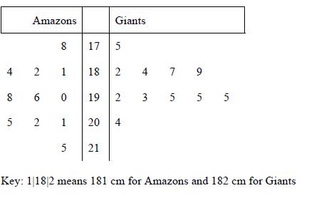 The heights, in $$\(\mathrm{cm}\)$$, of the 11 basketball players in each of two clubs, the Amazons and the Giants, are shown below. Represent the data by drawing a back-to-back stem-and-leaf diagram with Amazons on the left-hand side of the diagram.