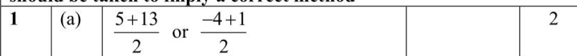 The point $$\(A\)$$ has coordinates $$\((5,-4)\)$$ The point $$\(B\)$$ has coordinates $$\((13,1)\)$$ (a) Work out the coordinates of the midpoint of $$\(A B\)$$. (2)