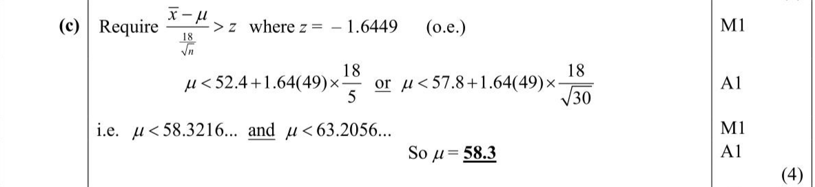 The scores in a national test of seven-year-old children are normally distributed with a standard deviation of 18 A random sample of 25 seven-year-old children from town $$\(A\)$$ had a mean score of 52.4 Find the largest possible value for $$\(\mu\)$$. (4)