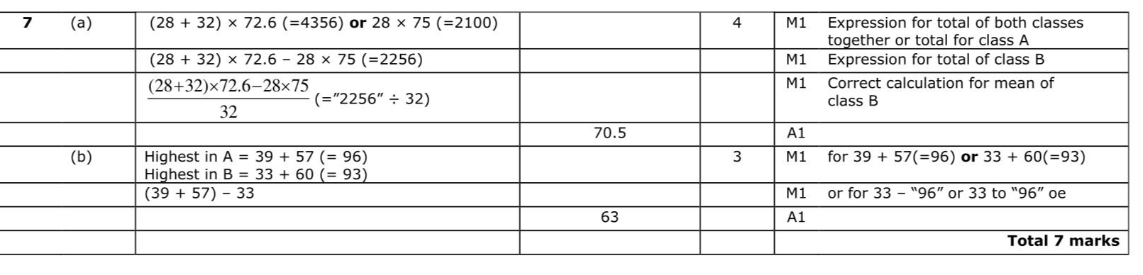 The students in Class A and in Class B take the same examination. There are 28 students in Class A and 32 students in Class B. The mean score for all the students in both classes is 72.6 The mean score for the students in Class A is 75 (a) Work out the mean score for the students in Class B. (4) The lowest score in Class A is 39 The range of scores for Class $$\(\mathrm{A}\)$$ is 57 The lowest score in Class B is 33 The range of scores for Class B is 60 (b) Find the range of scores for all the students in both classes. (3)