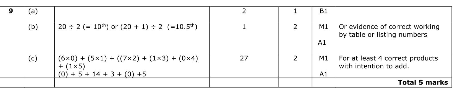 The table shows information about the number of goals scored by a football team in each of 20 matches. (a) Write down the mode of the number of goals scored. (1) (b) Find the median number of goals scored. (2) (c) Work out the total number of goals scored. (2)