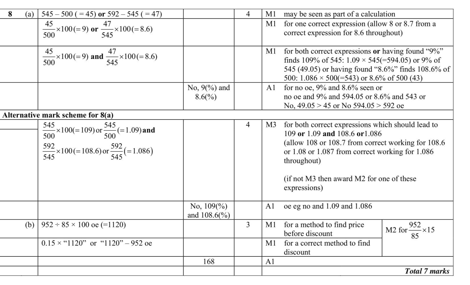 The table shows the cost, in euros, of Brigitte's car insurance in each of the years 2016, 2017 and 2018 Brigitte says, "The percentage increase in the cost of my car insurance from 2017 to 2018 is more than the percentage increase in the cost of my car insurance from 2016 to 2017" (a) Is Brigitte correct? You must show how you get your answer. (4) Henri wants to insure his car. He gets a discount of $$\(15 \%\)$$ off the normal price. Henri pays 952 euros for his car insurance after the discount. (b) Work out the discount that Henri gets. euros (3)