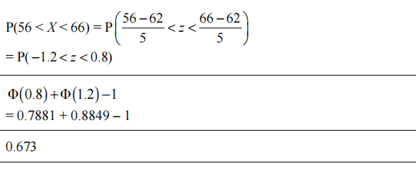 The times taken to swim 100 metres by members of a large swimming club have a normal distribution with mean 62 seconds and standard deviation 5 seconds. Find the probability that a randomly chosen member of the club takes between 56 and 66 seconds to swim 100 metres. ........................................................................................................................................................ ........................................................................................................................................................ ........................................................................................................................................................ ........................................................................................................................................................ ........................................................................................................................................................ ........................................................................................................................................................ ........................................................................................................................................................ ........................................................................................................................................................ ........................................................................................................................................................ ........................................................................................................................................................