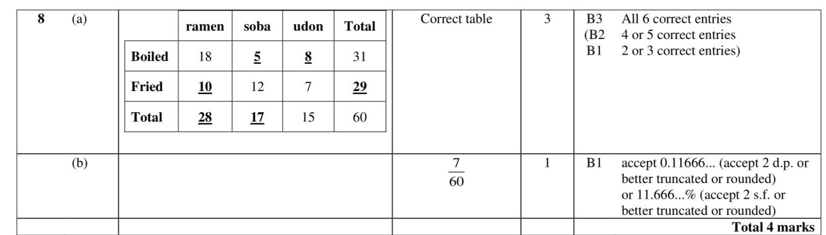 The two-way table shows some information about the 60 noodle meals eaten in a noodle bar by each of 60 people last Friday. (a) Complete the two-way table. (3) One of the 60 people is selected at random. (b) Write down the probability that this person ate Fried Udon noodles. (1)