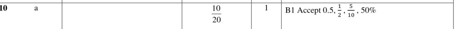There are 20 counters in bag $$\(\mathbf{X}\)$$. 7 of the counters are green. 10 of the counters are red. The rest of the counters are blue. Ruth takes at random a counter from bag $$\(\mathbf{X}\)$$. (a) Write down the probability that the counter is red. (1)