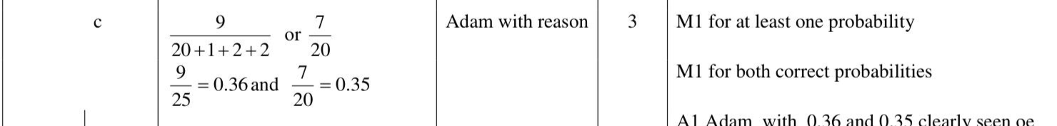 There are 20 counters in bag $$\(\mathbf{X}\)$$. 7 of the counters are green. 10 of the counters are red. The rest of the counters are blue. Ruth puts the counter back into bag $$\(\mathbf{X}\)$$. Bag $$\(\mathbf{Y}\)$$ only contains green counters, red counters and blue counters. In bag $$\(\mathbf{Y}\)$$ there are, 2 more green counters than in bag $$\(\mathbf{X}\)$$ 1 more red counter than in bag $$\(\mathbf{X}\)$$ 2 more blue counters than in bag $$\(\mathbf{X}\)$$ Adam takes at random a counter from bag $$\(\mathbf{Y}\)$$. Ruth takes at random a counter from bag $$\(\mathbf{X}\)$$. (c) Who has the greater probability of taking a green counter, Adam or Ruth? Show your working clearly. (3)
