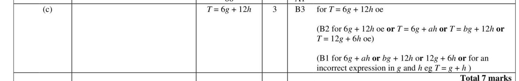 There are 6 eggs in a small box of eggs. There are 12 eggs in a large box of eggs. Alex buys $$\(g\)$$ small boxes of eggs and $$\(h\)$$ large boxes of eggs. He buys a total of $$\(T\)$$ eggs. (c) Write down a formula for $$\(T\)$$ in terms of $$\(g\)$$ and $$\(h\)$$. (3)