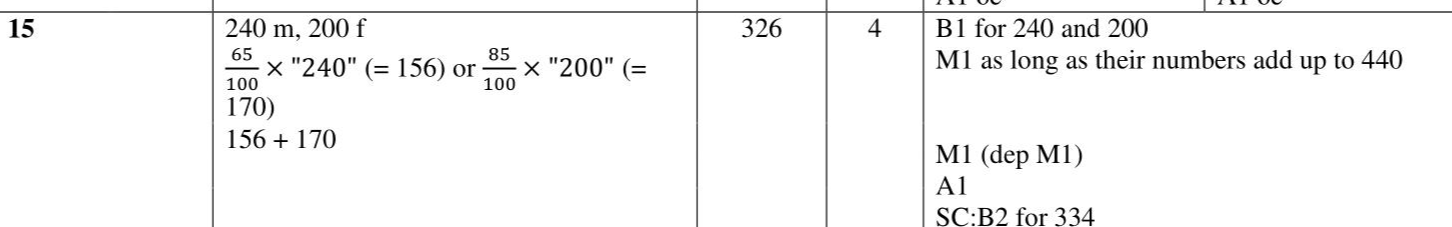 There are 440 students at a school. The number of male students is 40 more than the number of female students. $$\(65 \%\)$$ of the male students like art. $$\(85 \%\)$$ of the female students like art. Work out the total number of students at the school who like art.