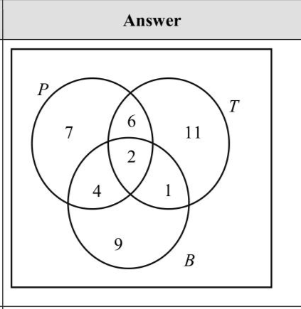 This year, 40 students have each travelled by one or more of plane $$\((P)\)$$, train $$\((T)\)$$ or boat $$\((B)\)$$. 7 have travelled only by plane. 11 have travelled only by train. 9 have travelled only by boat. $$\[ \begin{aligned} &\mathrm{n}(P \cap T)=8 \\ &\mathrm{n}(B \cap T)=3 \\ &\mathrm{n}(B \cap P)=6 \end{aligned} \]$$ Complete the Venn diagram.