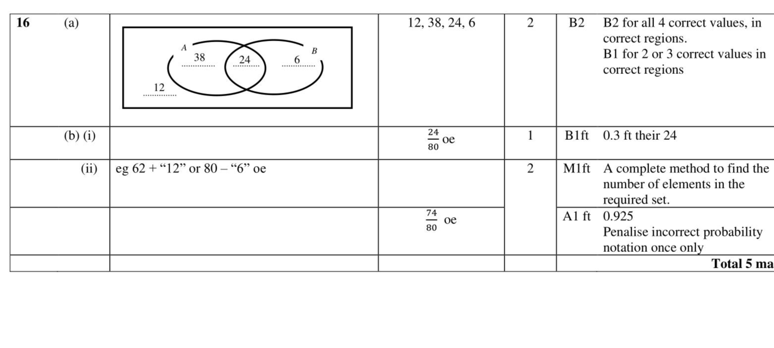 Two events $$\(A\)$$ and $$\(B\)$$ are such that $$\(\mathrm{n}(A)=62 \mathrm{n}(B)=30\)$$ and $$\(\mathrm{n}(A \cup B)=68\)$$ Given that $$\(\mathrm{n}(\mathscr{E})=80\)$$ (a) complete the Venn diagram to show the number of elements in each region. (2) An element is chosen at random from $$\(\mathscr{E}\)$$. (b) Using the Venn diagram, find the probability that this element is in (i) $$\(A \cap B\)$$ (1) (ii) $$\(A \cup B^{\prime}\)$$ (2)