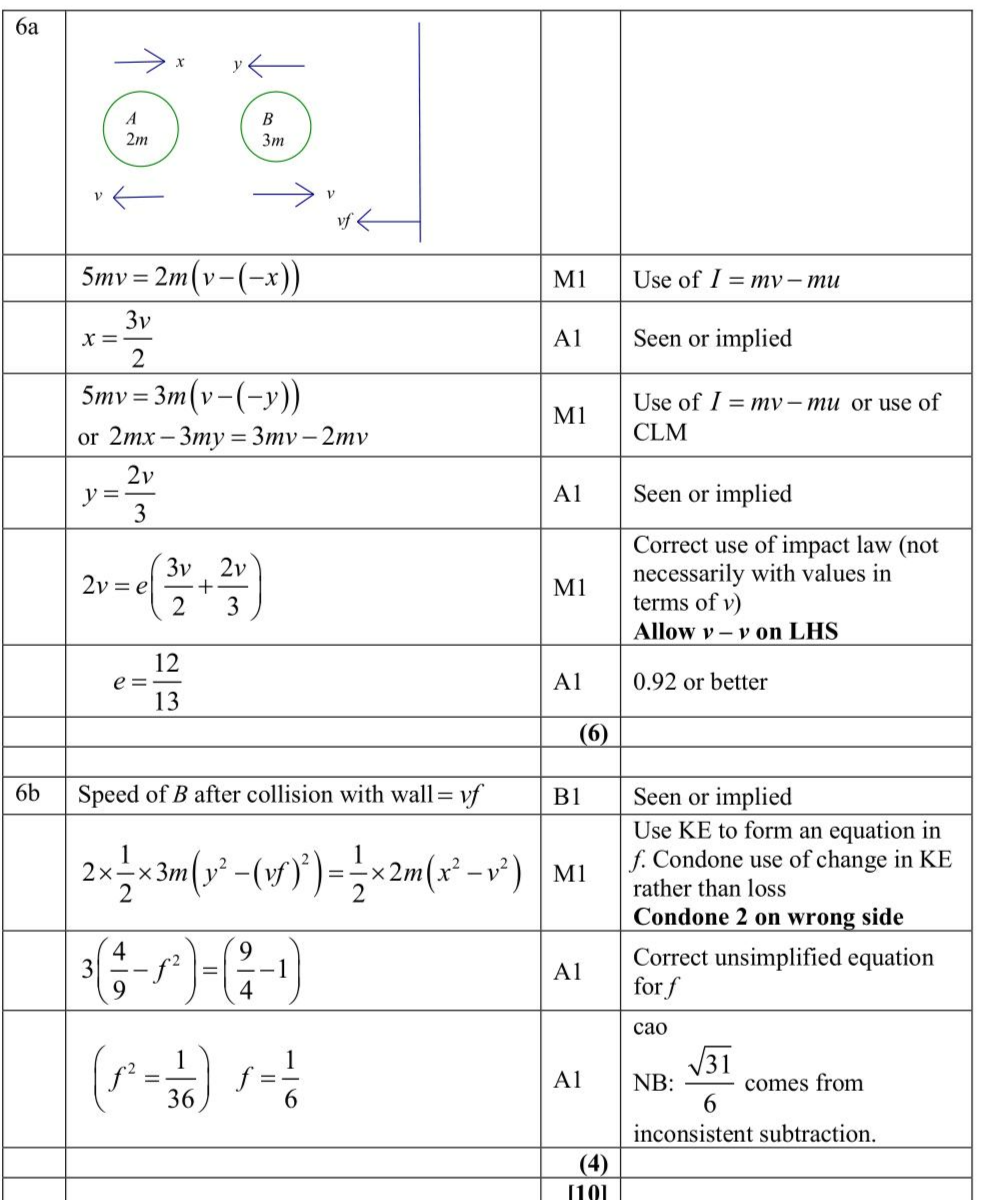 Two particles, $$\(A\)$$ and $$\(B\)$$, are moving in opposite directions along the same straight line on a smooth horizontal surface when they collide directly. The mass of $$\(A\)$$ is $$\(2 m\)$$ and the mass of $$\(B\)$$ is $$\(3 m\)$$. Immediately after the collision, $$\(A\)$$ and $$\(B\)$$ are moving in opposite directions with the same speed $$\(v\)$$. In the collision, $$\(A\)$$ receives an impulse of magnitude $$\(5 \mathrm{mv}\)$$. (a) Find the coefficient of restitution between $$\(A\)$$ and $$\(B\)$$. (6) After the collision with $$\(A\)$$, particle $$\(B\)$$ strikes a smooth fixed vertical wall and rebounds. The wall is perpendicular to the direction of motion of the particles. The coefficient of restitution between $$\(B\)$$ and the wall is $$\(f\)$$. As a result of its collision with $$\(A\)$$ and with the wall, the total kinetic energy lost by $$\(B\)$$ is $$\(E\)$$. As a result of its collision with $$\(B\)$$, the kinetic energy lost by $$\(A\)$$ is $$\(2 E\)$$. (b) Find the value of $$\(f\)$$. (4)
