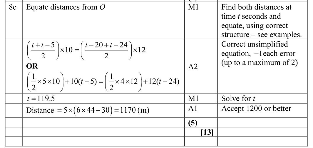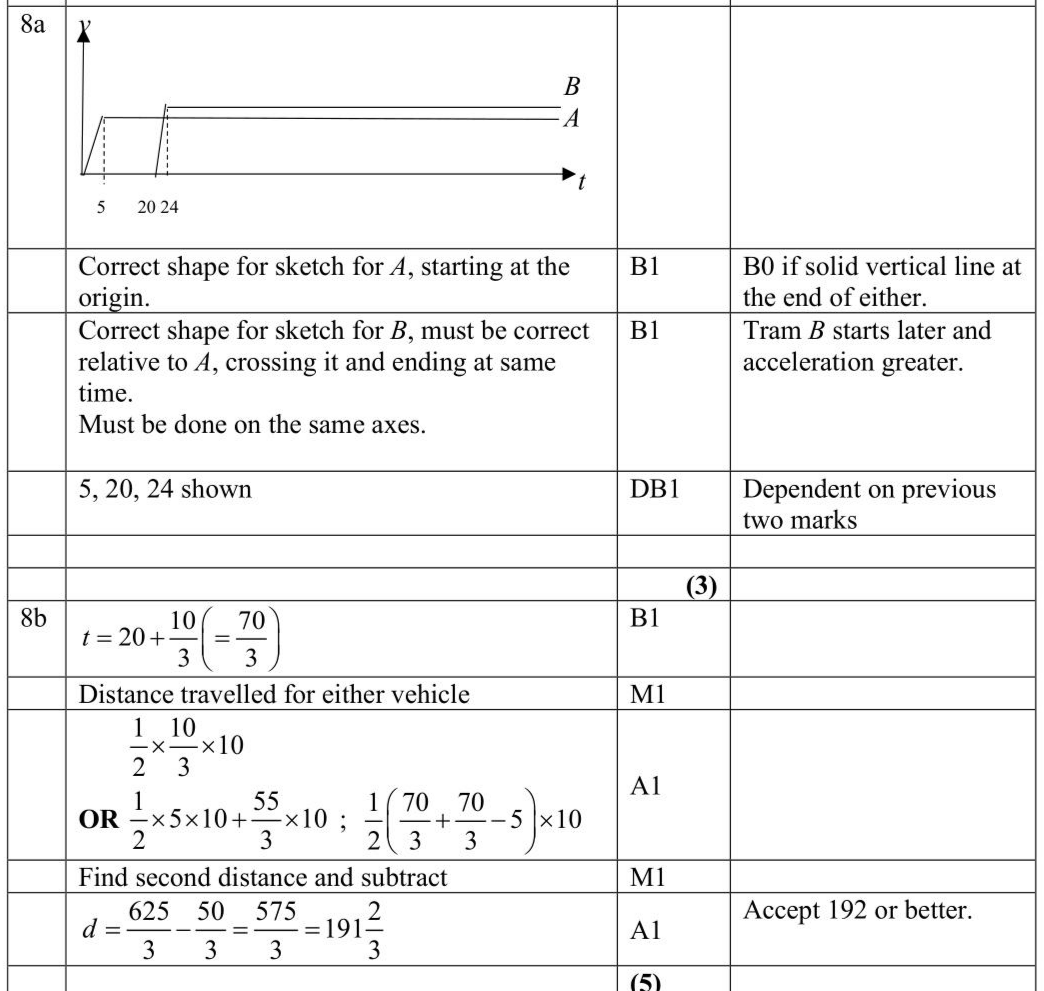 Two trams, $$\(\operatorname{tram} A\)$$ and tram $$\(B\)$$, run on parallel straight horizontal tracks. Initially the two trams are at rest in the depot and level with each other. At time $$\(t=0, \operatorname{tram} A\)$$ starts to move. Tram $$\(A\)$$ moves with constant acceleration $$\(2 \mathrm{~m} \mathrm{~s}^{-2}\)$$ for 5 seconds and then continues to move along the track at constant speed. At time $$\(t=20\)$$ seconds, tram $$\(B\)$$ starts from rest and moves in the same direction as $$\(\operatorname{tram} A\)$$. Tram $$\(B\)$$ moves with constant acceleration $$\(3 \mathrm{~m} \mathrm{~s}^{-2}\)$$ for 4 seconds and then continues to move along the track at constant speed. The trams are modelled as particles. (a) Sketch, on the same axes, a speed-time graph for the motion of tram $$\(A\)$$ and a speed-time graph for the motion of $$\(\operatorname{tram} B\)$$, from $$\(t=0\)$$ to the instant when $$\(\operatorname{tram} B\)$$ overtakes tram $$\(A\)$$. (3) At the instant when the two trams are moving with the same speed, tram $$\(A\)$$ is $$\(d\)$$ metres in front of $$\(\operatorname{tram} B\)$$. (b) Find the value of $$\(d\)$$. (5) (c) Find the distance of the trams from the depot at the instant when $$\(\operatorname{tram} B\)$$ overtakes $$\(\operatorname{tram} A\)$$. (5)
