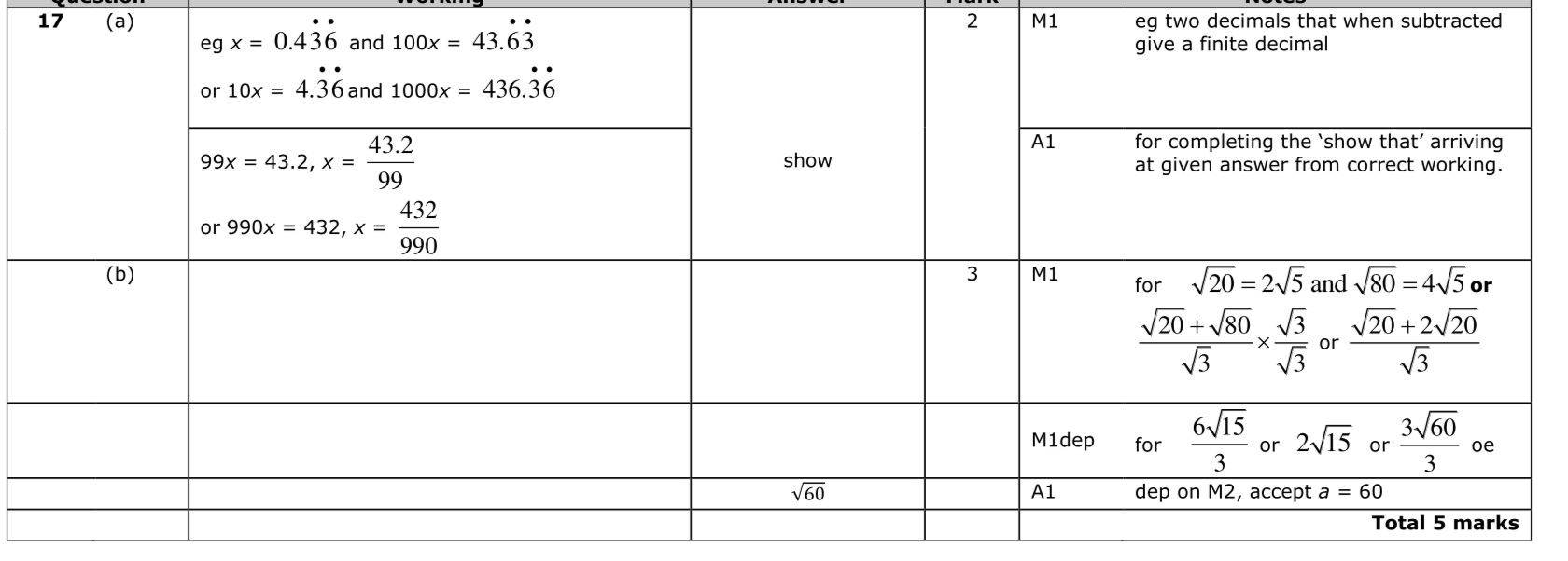 Use algebra to show that $$\(0.4 \ddot{3} \dot{6}=\frac{24}{55}\)$$ (2) (b) Show that $$\(\frac{\sqrt{20}+\sqrt{80}}{\sqrt{3}}\)$$ can be expressed in the form $$\(\sqrt{a}\)$$ where $$\(a\)$$ is an integer. Show your working clearly. (3)