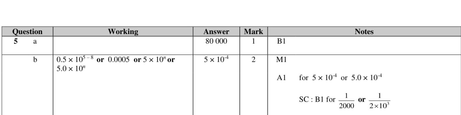 Write $$\(8 \times 10^{4}\)$$ as an ordinary number. (1) (b) Work out $$\(\left(3.5 \times 10^{5}\right) \div\left(7 \times 10^{8}\right)\)$$ Give your answer in standard form. (2)