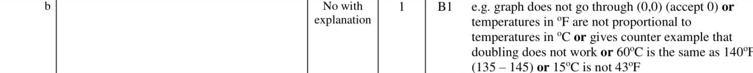 You can use this graph to change between temperatures in degrees Celsius $$\(\left({ }^{\circ} \mathrm{C}\right)\)$$ and temperatures in degrees Fahrenheit $$\(\left({ }^{\circ} \mathrm{F}\right)\)$$. Maninder says, " $$\(30^{\circ} \mathrm{C}\)$$ is the same as $$\(86^{\circ} \mathrm{F}\)$$, therefore $$\(60^{\circ} \mathrm{C}\)$$ will be the same as $$\(172^{\circ} \mathrm{F}\)$$." (b) Is Maninder correct? Give a reason for your answer. (1)