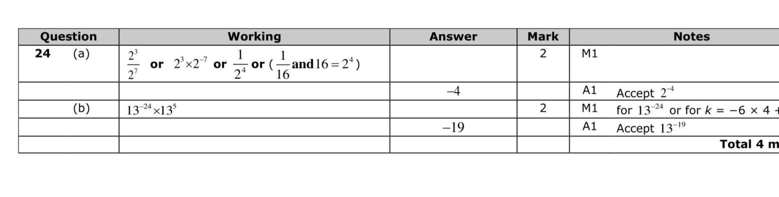 $$\(24 \frac{8}{2^{7}}=2^{n}\)$$ (a) Find the value of $$\(n\)$$. $$\(n=\)$$ (2) $$\(\left(13^{-6}\right)^{4} \times 13^{5}=13^{k}\)$$ (b) Find the value of $$\(k\)$$. $$\(k=\)$$ (2)