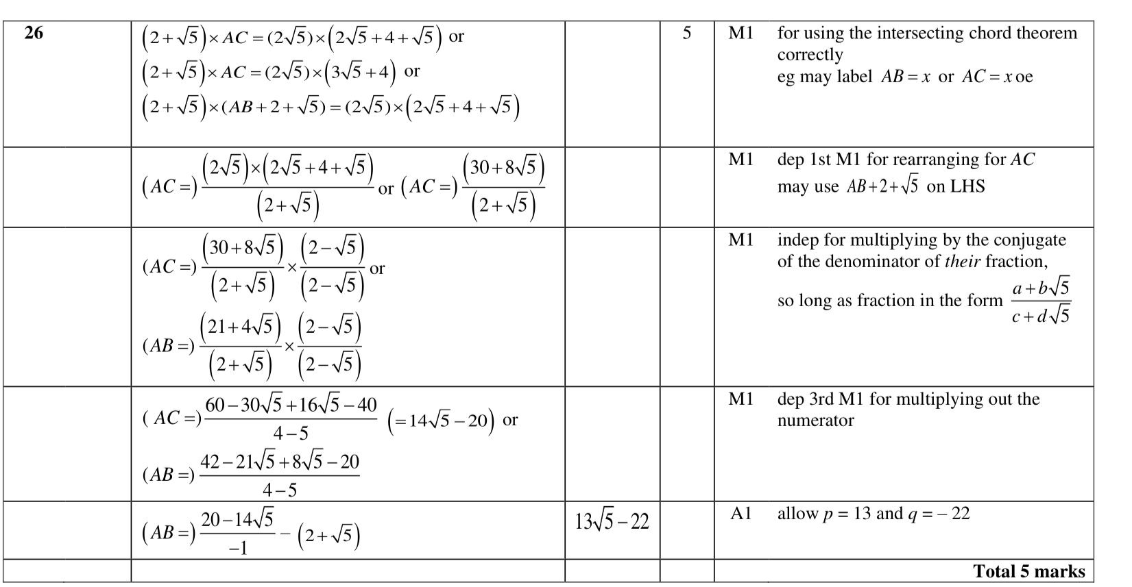 $$\(26 A, B, D\)$$ and $$\(E\)$$ are points on a circle. $$\(A B C\)$$ and $$\(E D C\)$$ are straight lines. Diagram NOT accurately drawn Show that the length of $$\(A B\)$$ is $$\((p \sqrt{5}+q) \mathrm{cm}\)$$, where $$\(p\)$$ and $$\(q\)$$ are integers whose values are to be found. Show your working clearly.