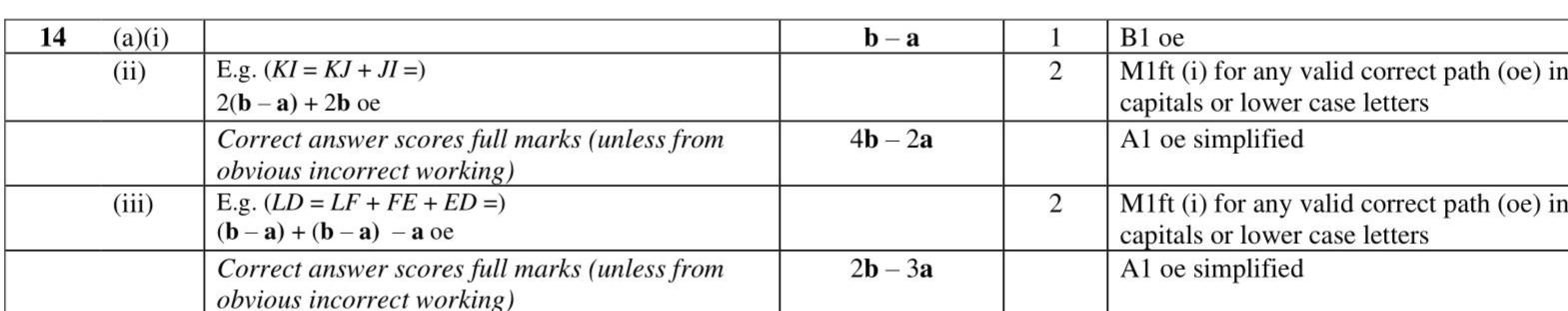 $$\(14 A B C D E F\)$$ and $$\(G H I J K L\)$$ are regular hexagons each with centre $$\(O\)$$. GHIJKL is an enlargement of $$\(A B C D E F\)$$, with centre $$\(O\)$$ and scale factor 2 $$\(\overrightarrow{O A}=\mathbf{a} \quad \overrightarrow{O B}=\mathbf{b}\)$$ (a) Write the following vectors, in terms of $$\(\mathbf{a}\)$$ and $$\(\mathbf{b}\)$$. Simplify your answers. (i) $$\(\overrightarrow{A B}\)$$ (1) (ii) $$\(\overrightarrow{K I}\)$$ (2) (iii) $$\(\overrightarrow{L D}\)$$ (2)