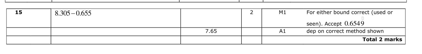 $$\(e=8.31\)$$ correct to 2 decimal places $$\(f=0.65\)$$ correct to 2 decimal places Work out the lower bound for the value of $$\(e-f\)$$ Show your working clearly. ...................................................