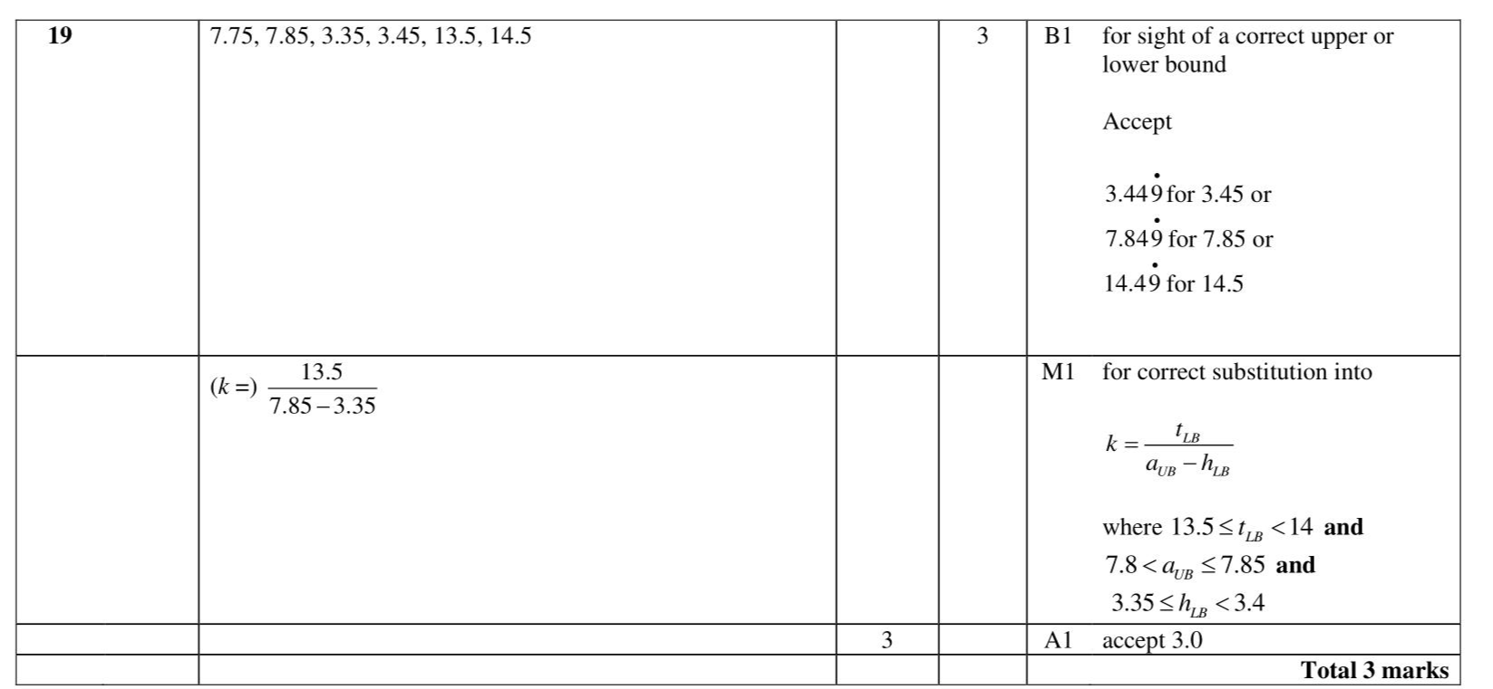$$\(19 k=\frac{t}{a-h}\)$$ $$\(t=14\)$$ correct to 2 significant figures $$\(a=7.8\)$$ correct to 2 significant figures $$\(h=3.4\)$$ correct to 2 significant figures Work out the lower bound for the value of $$\(k\)$$. Show your working clearly.