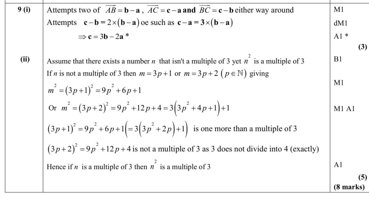 (i) Relative to a fixed origin $$\(O\)$$, the points $$\(A, B\)$$ and $$\(C\)$$ have position vectors $$\(\mathbf{a}, \mathbf{b}\)$$ and $$\(\mathbf{c}\)$$ respectively. Points $$\(A, B\)$$ and $$\(C\)$$ lie in a straight line, with $$\(B\)$$ lying between $$\(A\)$$ and $$\(C\)$$. Given $$\(A B: A C=1: 3\)$$ show that $$\[ \mathbf{c}=3 \mathbf{b}-2 \mathbf{a} \]$$ (3) (ii) Given that $$\(n \in \mathbb{N}\)$$, prove by contradiction that if $$\(n^{2}\)$$ is a multiple of 3 then $$\(n\)$$ is a multiple of 3 (5)