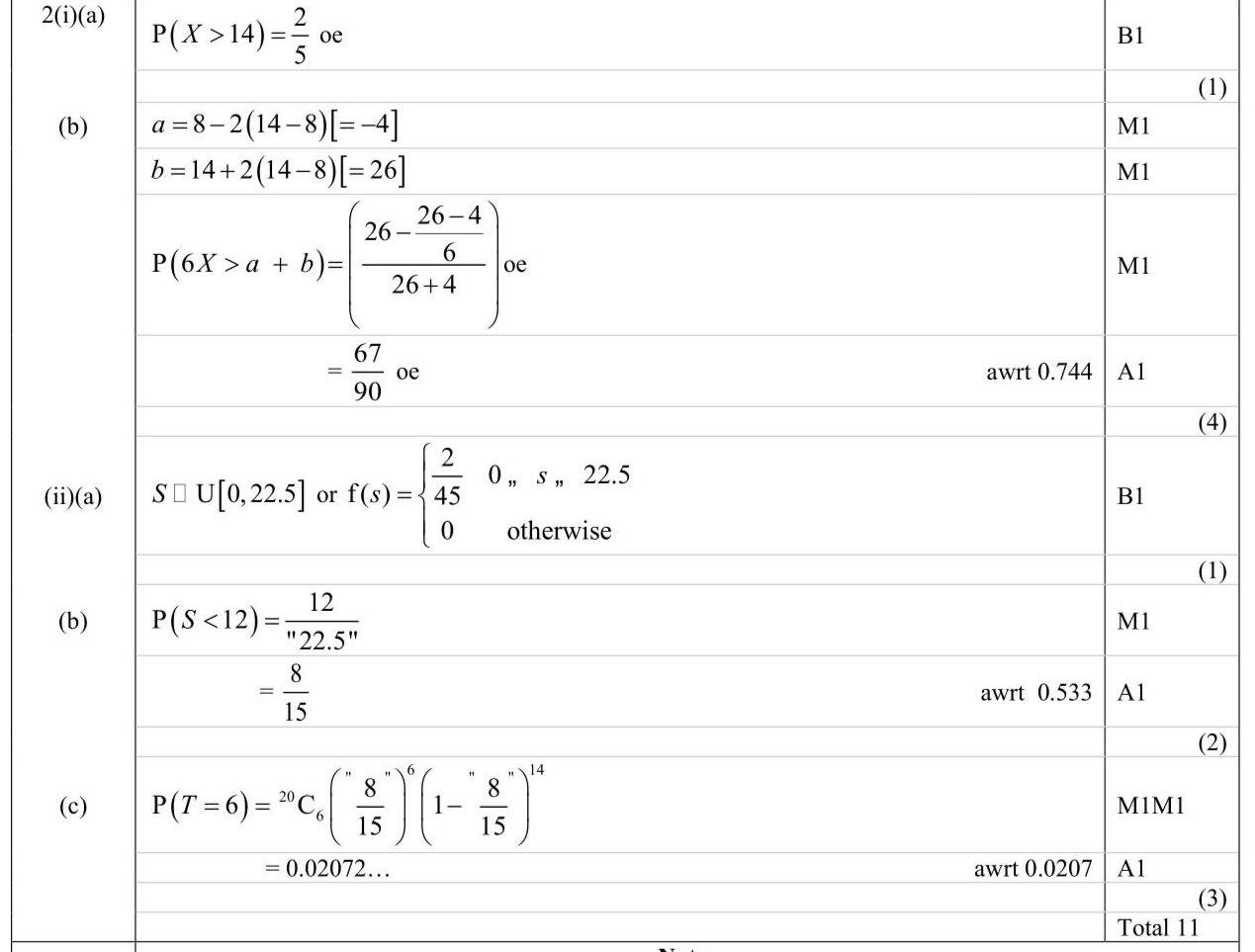 (i) The continuous random variable $$\(X\)$$ is uniformly distributed over the interval $$\([a, b]\)$$ Given that $$\(\mathrm{P}(8< X< 14)=\frac{1}{5}\)$$ and $$\(\mathrm{E}(X)=11\)$$ (a) write down $$\(\mathrm{P}(X> 14)\)$$ (1) (b) find $$\(\mathrm{P}(6 X> a+b)\)$$ (4) (ii) Susie makes a strip of pasta $$\(45 \mathrm{~cm}\)$$ long. She then cuts the strip of pasta, at a randomly chosen point, into two pieces. The random variable $$\(S\)$$ is the length of the shortest piece of pasta. (a) Write down the distribution of $$\(S\)$$ (1) (b) Calculate the probability that the shortest piece of pasta is less than $$\(12 \mathrm{~cm}\)$$ long. (2) Susie makes 20 strips of pasta, all $$\(45 \mathrm{~cm}\)$$ long, and separately cuts each strip of pasta, at a randomly chosen point, into two pieces. (c) Calculate the probability that exactly 6 of the pieces of pasta are less than $$\(12 \mathrm{~cm}\)$$ long. (3)