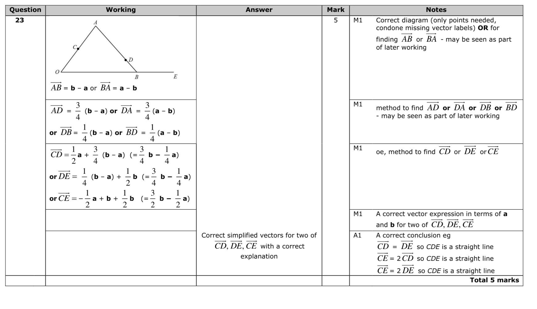$$\(23 O A B\)$$ is a triangle. $$\(C\)$$ is the midpoint of $$\(O A\)$$. $$\(D\)$$ is the point on $$\(A B\)$$ such that $$\(A D: D B=3: 1\)$$ $$\(E\)$$ is the point such that $$\(\overrightarrow{O B}=2 \overrightarrow{B E}\)$$ Using a vector method, prove that the points $$\(C, D\)$$ and $$\(E\)$$ lie on the same straight line.